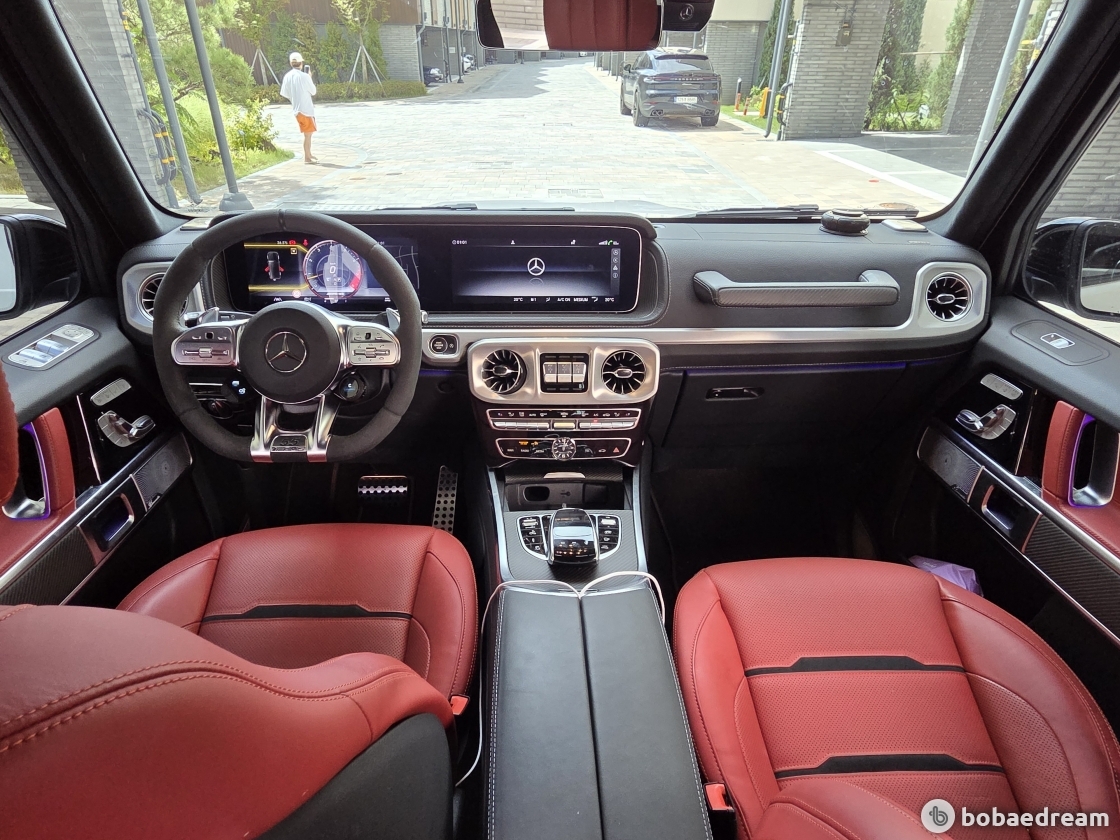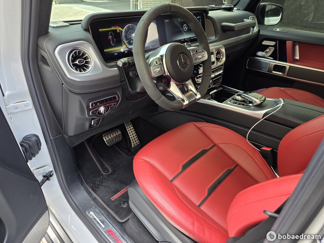 실내에는 클래식 레드 및 블랙 컬러의 나파 가죽 시트가 적용됐다. AMG 매트 카본 파이버 트림이 적용돼 독보