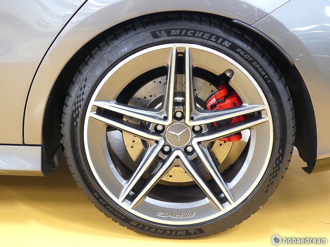 AMG 5트윈 스포크 경량 알로이 휠, 레드 컬러 브레이크 캘리퍼로 스포티한 느낌을 자아낸다. 후면부는 AMG