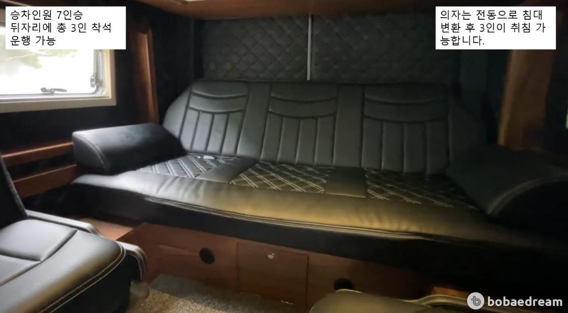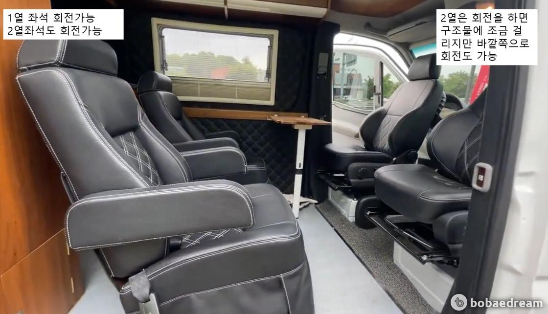 차량스팩은 1,2열 회전시트, 4채널 블랙박스, 4M어닝, 자동문, 노래방, 딜라이브설치 엘지 TV, 벨에어에어콘,